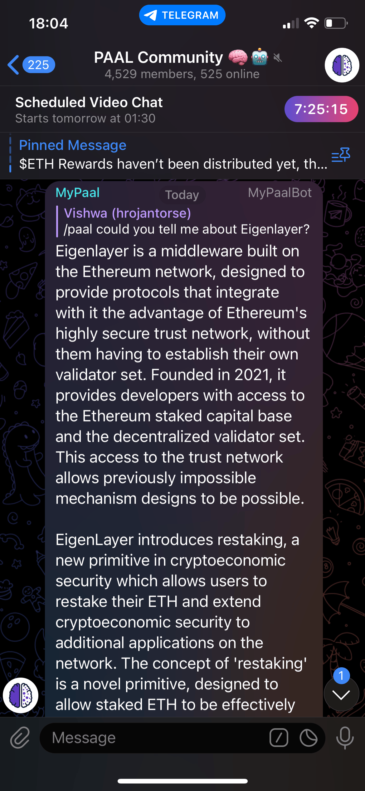 When i ask /PAAL about Eigenlayer, it is quick to generate information for me that is a quick summary.